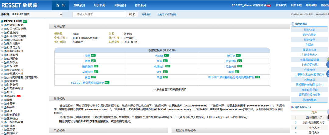 RESSET 金融研究数据库(RESSET/DB)是一个为模型检验、投资研究等提供专业服务的数据平台。RESSET/DB 由多位国内外著名高校和研究机构专家的全程参与,参照了国际权威数据库 CRSP, Compustat 等的设计标准,又结合中国金融市场的实际情况,以实证研究为导向进行整体设计而成。RESSET/DB 设计体系科学先进,数据全面准确,提供多种数据获取模式,方便易用,是为模型检验、投资研究、实证研究、学科与实验室建设等提供专业服务的数据平台。