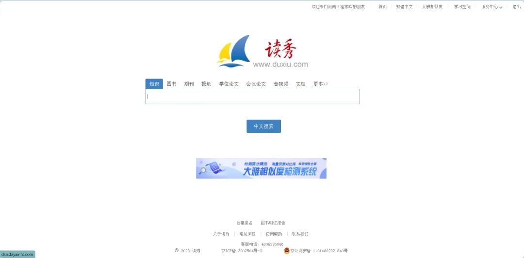 “读秀学术搜索”是全球最大的中文文献资源服务平台。它是由海量图书,期H、报纸、会议论文、学位论文、标准、专利及学术视频等学术资源组成的庞大的知识系统,是一个可以对文献资源及其全文内容进行深度检索,并且提供原文传送服务的平台。目前我馆订购了包含 590 万种图书书目、310 万种全文图书、16.5 亿页全文资料、8000 万条期刊元数据、5000 万条报纸元数据、100 万个人物简介、1000 万个词条解释等一系列海量学术资源检索及使用。