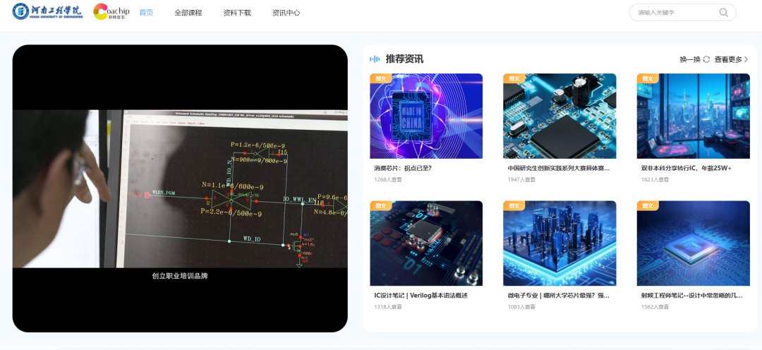 一款专为高校打造的中文视频资源库,视频资源量超10000+课时,适用于电气工程、自动化、电子信息工程、通信工程、自动化、计算机科学与技术、软件工程、网络工程、物联网工程、人工智能、材料科学与工程等专业。针对高校机构用户打造的数字资源服务平台,将产业方向与专业方向相结合,满足不同专业对不同IC岗位的学习需求,内容涵盖芯片设计、制造、封装、测试、销售及管理等方向课程,集合了6个产业方向、14个专业方向和集成电路相关专业,同时还会定期推送半导体行业前沿资讯,便于学员了解行业动态。平台视频资源量丰富,提供了丰富的IC理论和实践课程,用户可以根据自己的专业和感兴趣的产业方向进行课程筛选进入学习阶段,平台包含课程视频、在线测试和实战案例,帮助平台用户学习和掌握IC知识和技能。