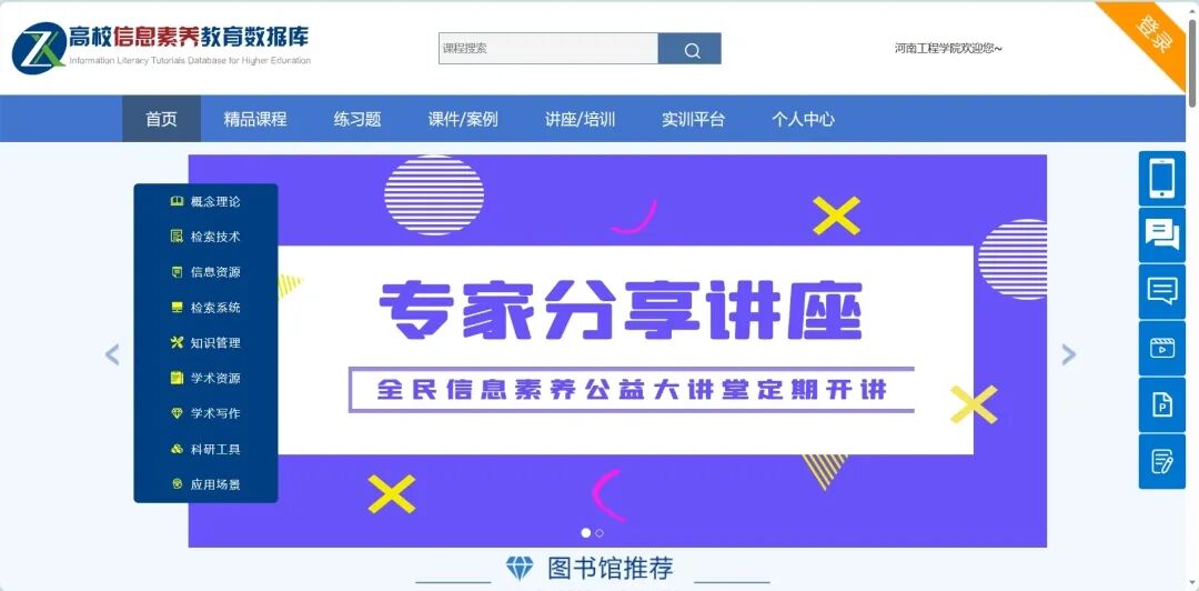 高校信息素养教育数据库是一款供读者学习信息检索、提升信息素养能力的专业视频类数据库。信息素养是高校学生适应当下信息社会需要具备的一种基本能力,信息时代,具有良好的信息素养,可以把事情做得更快、更好、更有效率,可以为自主学习、终身学习打下良好基础。信息素养数据库涵盖了概念理论篇、检索技术篇、信息资源篇、检索系统篇、知识管理篇、学术资源篇、学术写作篇、科研工具篇、应用场景篇九大模块的数百节培训课程,课程以微视频的方式,通过3-5分钟讲述一个有关于信息素养的知识点,包括如何查找文献、如何检索所需信息、如何识别信息需求、如何高效便捷地管理信息并利用获取到的信息解决问题等等,课程短小精悍、干货满满,便于读者利用碎片化时间进行学习。