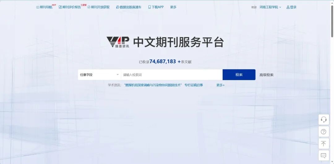 维普中文期刊服务平台是由原中国科学技术情报研究所重庆分所,现重庆维普智图数据科技有限公司推出的中文学术期刊大数据服务平台。依托《中文科技期刊数据库》数据支撑,自1989年推出,现已成为中文学术期刊最重要的传播与服务平台之一,成为国内教育、科研重要的学术资源基础设施。截至目前,平台已收录累计收录期刊14000余种,文献总量6300余万篇,覆盖全学科领域,为教育及科研用户提供了强大的文献检索与资源保障服务。
