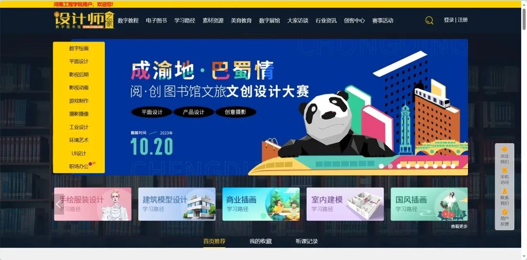 『设计师之家数字图书馆』为响应《国务院关于推进文化创意和设计服务与相关产业融合发展的若干意见》,针对图书馆和教学单位推出的艺术设计数字技能教育资源平台,分为[数字教程][学习路径][素材资源][美育教育][数字展馆][行业资讯][大家访谈][创客中心][赛事活动]九大模块。数字教程涉及数字绘画、平面设计、影视后期、影视动画、游戏制作、摄影摄像、工业设计、环境艺术、UI设计、职场办公十大领域。