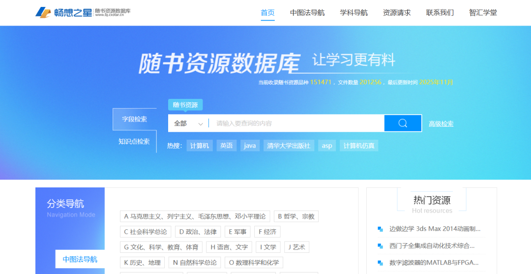 畅想之星随书资源数据库收录了自1990以来市面出版发行的14万多套各类随书资源,该库提供独立的平台入口,也支持嵌入OPAC做链接,方便读者快速获取随书资源。随书资源内容涵盖课件、语言听力、设计素材、程序代码等图书配套多媒体资源,包含纸书、电子书附带的光盘等附件内容,是在智慧图书馆建设下对传统图书的全面揭示。随书资源也从早期以物理光盘为载体转变为网络在线资源(二维码、超链接等引导方式),该库均有收录,时时更新。