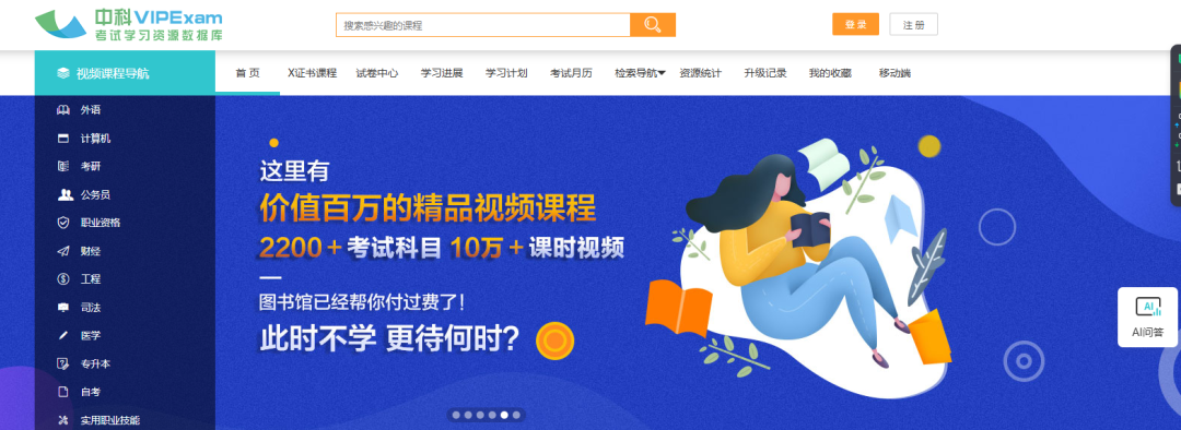 “中科VIPExam考试学习资源数据库”收录外语、计算机、公务员、专升本、职业资格、实用职业技能等12大专辑2200余个考试科目的精品视频课程、历年真题试卷与模拟试卷,其中职业资格专辑包含教师资格、企业人力资源管理师等学习资源,工程专辑包含消防工程师、建造师、造价工程师、安全工程师等学习资源,并提供了课程学练、模拟自测、错题记录、错题组卷、专项练习、学习进展等高效自主学习工具,助您轻松备考,战无不胜!