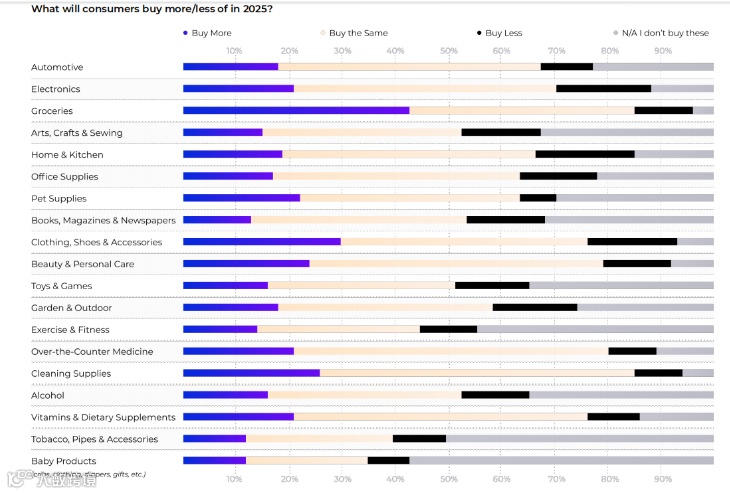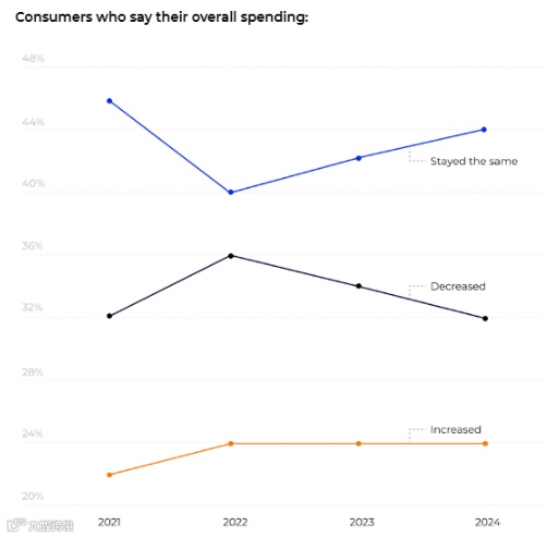 根据报告,2024年美国消费者支出保持稳定,24.1%的消费者支出有所增加,而44.0%的消费者支出稳定。然而,令人关注的是,2025年约三分之一的消费者预计会增加支出,尽管这一变化并非全体消费者普遍存在。