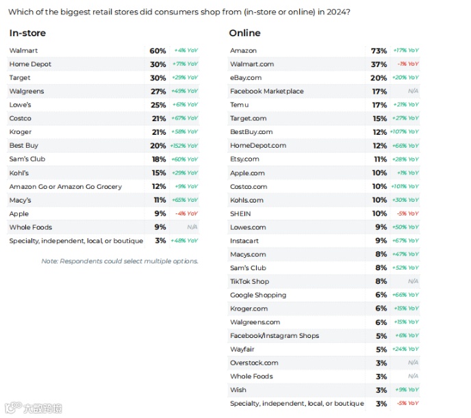 亚马逊依然是美国市场的主导电商平台,2024年有73%的消费者选择在亚马逊购物。然而,随着中国电商平台Temu和SHEIN的崛起,亚马逊面临着越来越激烈的竞争。Temu和SHEIN凭借低价策略在美国市场逐渐获得消费者青睐,尤其是Temu,其受欢迎度同比增长21%。尽管SHEIN略有下降,但其在时尚领域的强大竞争力仍然不可忽视。