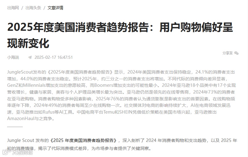 2025年,美国消费者市场正在经历重要的转型。根据JungleScout发布的《2025年度美国消费者趋势报告》,随着经济波动、技术进步和购物习惯的变化,美国消费者的购物偏好和支出趋势呈现出新的变化。这不仅为美国本土的电商平台带来挑战,也为中国跨境电商平台,特别是Temu和SHEIN,提供了巨大的增长机遇。