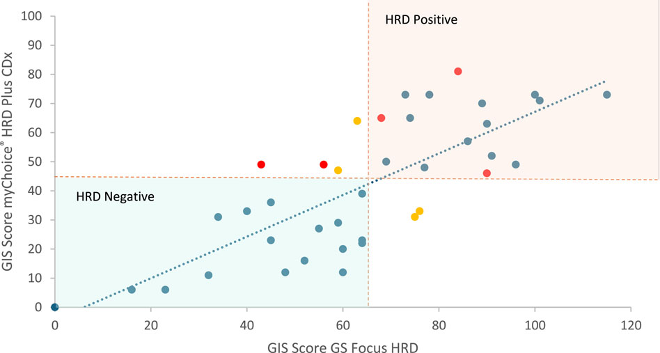 图注:两种HRD检测方法获得的GIS得分之间的相关性