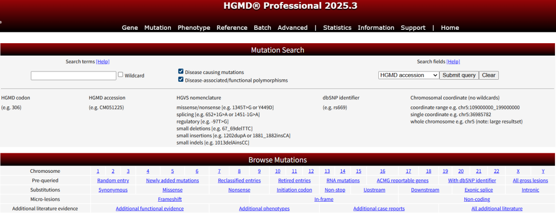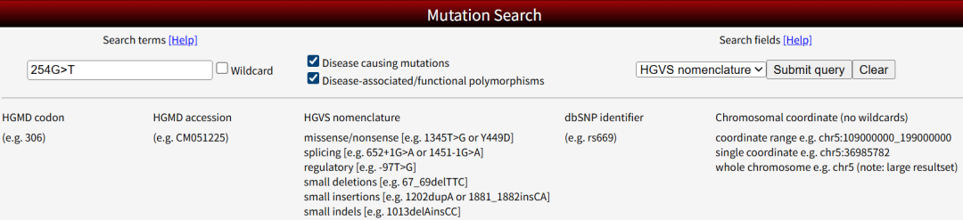 点击上方菜单栏的Mutation,即可进入突变搜索界面。下图中可见HGMD密码子、HGMD编号、HGVS命名、dbSNP标识符、染色体坐标五种搜索选项,点击Submit query前注意从下拉菜单中选择正确的类别。