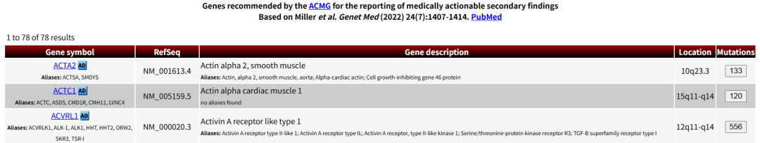 点击右下方的ACMG reportable genes,即可进入ACMG指南推荐报告的基因列表。