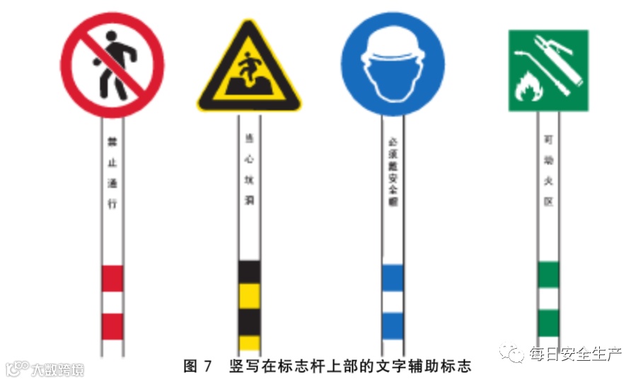 错误三:安全标志辅助文字内容、颜色未按规定,标志杆上未有文字辅助标志。