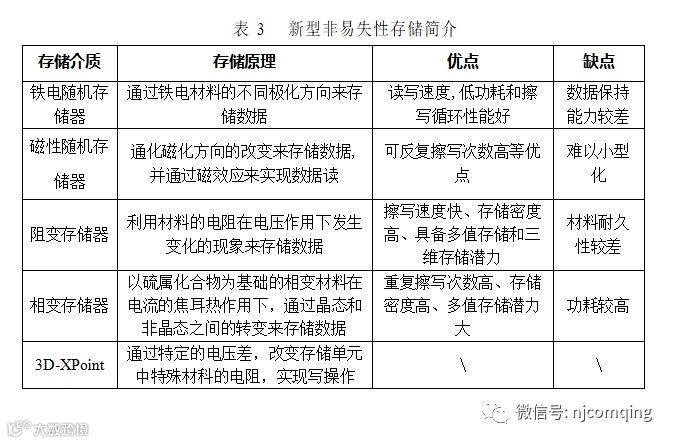为开发出比传统非易失性存储介质更高速、更低功耗、更高密度、更可靠的新型非易失性存储介质,研究者们把目光聚焦到一些特殊材料上,提出了一些存储介质模型。下表对这五种存储介质的存储原理、优缺点及发展状况进行了简要介绍。