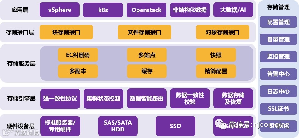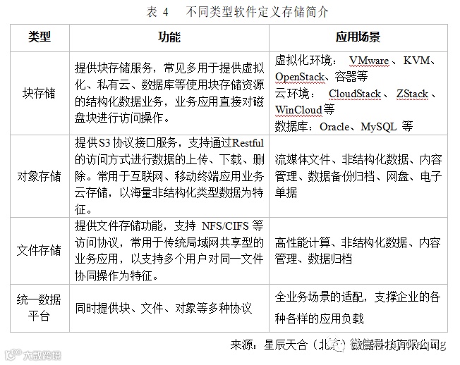 软硬解耦、易于扩展、自动化、基于策略或者应用的驱动是软件定义存储的特征。就业务应用来说,即不限制上层应用,不绑定下层硬件;除了提供块存储,也可以在同一平台提供文件、对象、HDFS等存储服务,实现非结构化数据的协议互通;同时应具备完善的监控能力,实现应用感知。