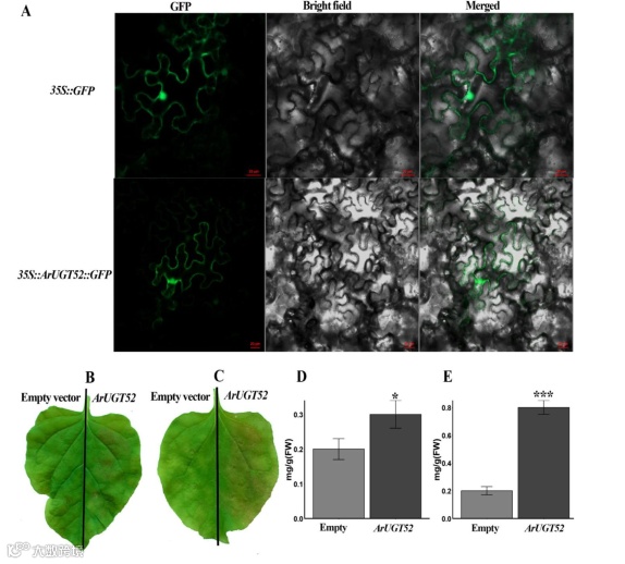 3.亚细胞定位与异源过表达验证:亚细胞定位结果表明,ArUGT52定位于细胞质(糖基化反应的主要场所),符合酶基因的功能场所预期。在烟草中过表达ArUGT52后,烟草的花青素含量显著提升,常温下增加4.5倍,低温下增加6.8倍,直接证实其对花青素积累的促进作用。