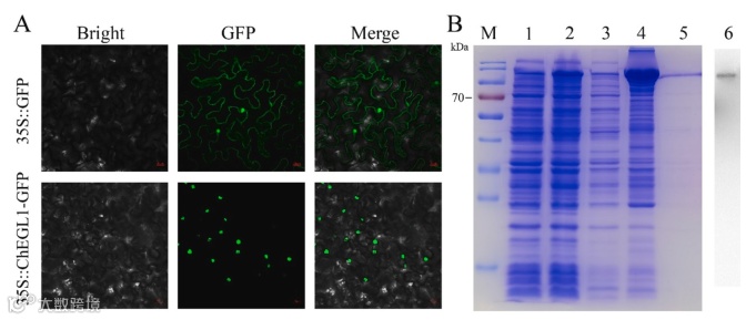 ChEGL1特征分析:(A) ChEGL1亚细胞定位,(B) ChEGL1 重组蛋白SDS-PAGE Western Blot
