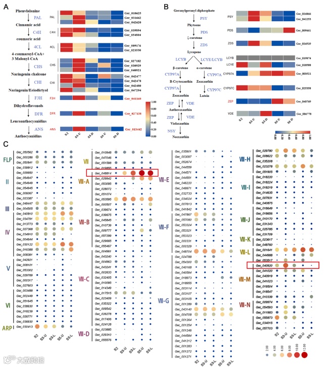 小结:本研究首次对非洲菊MYB基因家族进行系统解析,鉴定出319个家族成员并明确其分类,揭示出R2R3-MYB亚家族中的VIII亚家族可能参与非洲菊特有的代谢过程。通过表达分析锁定GhMYB114和GhMYB24两个关键基因,分别调控红色花瓣中花青素、黄色花瓣中类胡萝卜素的合成,同源比对进一步佐证了二者功能,为非洲菊双色表型分子机制的解析及花色育种提供了关键基因与理论依据。
