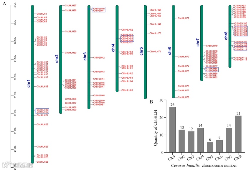 bHLH基因在欧李基因组上的分布,蓝框为串联重复基因