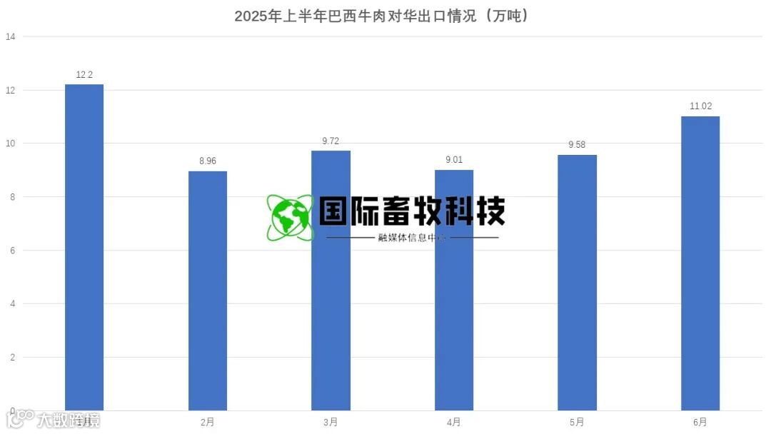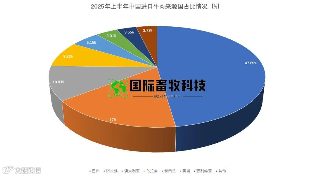 巴西作为中国最大的牛肉进口来源国,上半年进口量达 60.5 万吨,虽同比减少 4637 吨,但其市场份额却升至 46%,同比提升 4 个百分点,继续扮演 “压舱石” 角色。