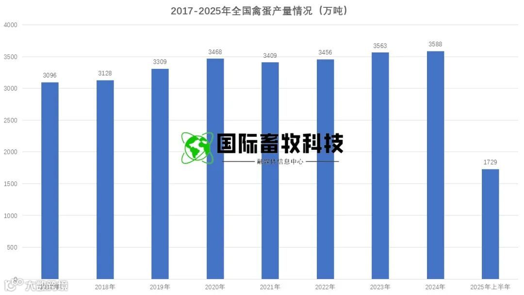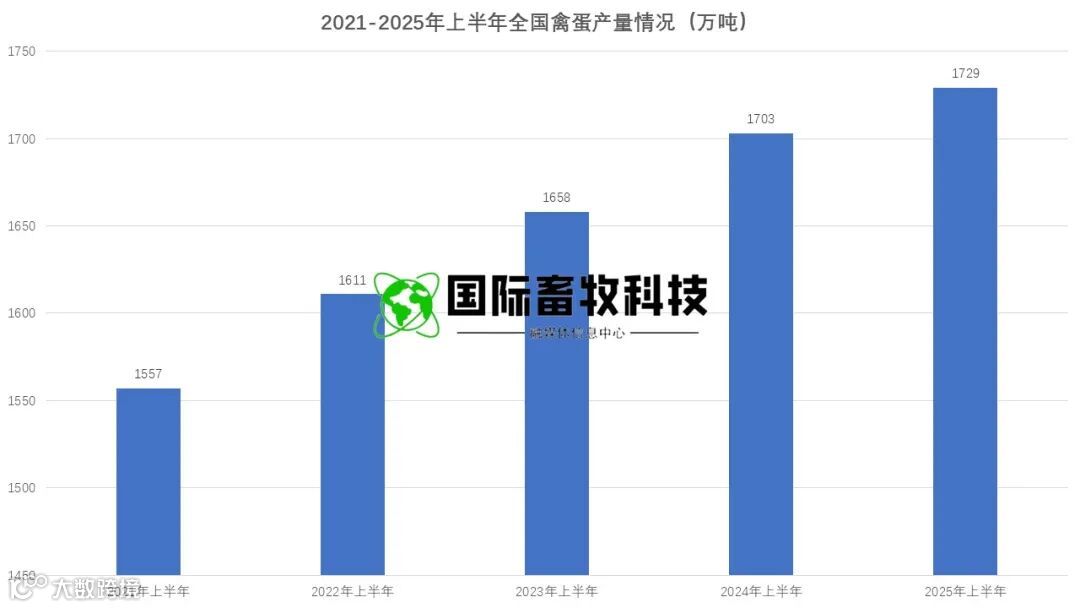 上半年禽蛋产量 1729 万吨,同比增长 1.5%,连续两年突破 1700 万吨,其中二季度单季产量 863 万吨,同比增幅 3.2%,呈现 "先抑后扬" 的走势: