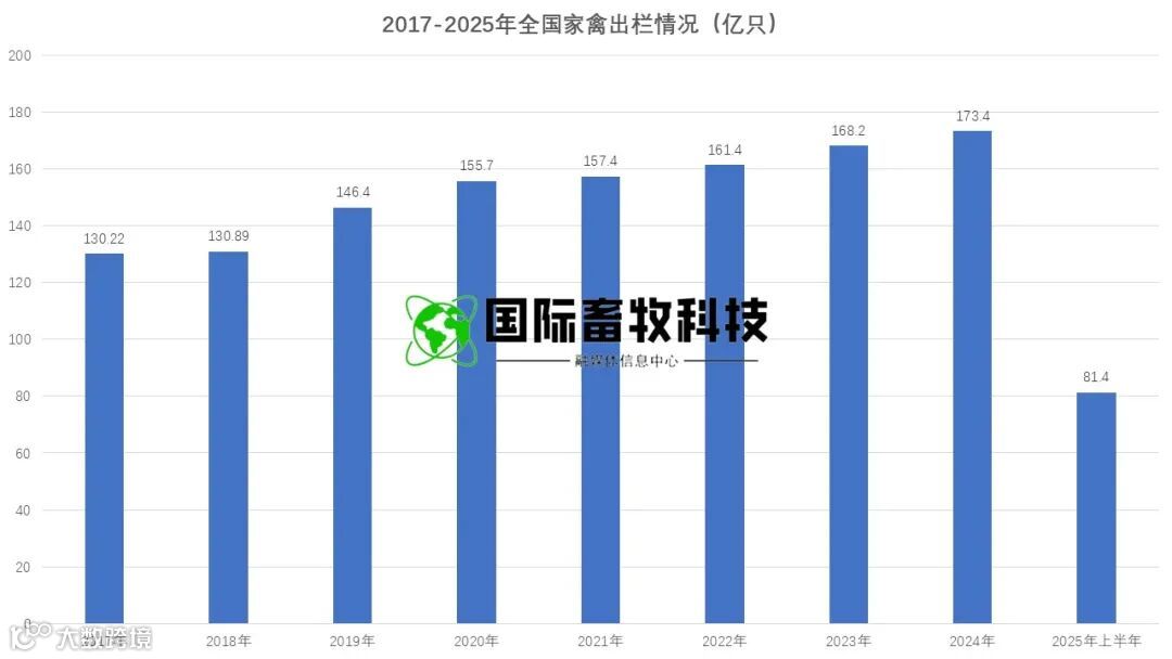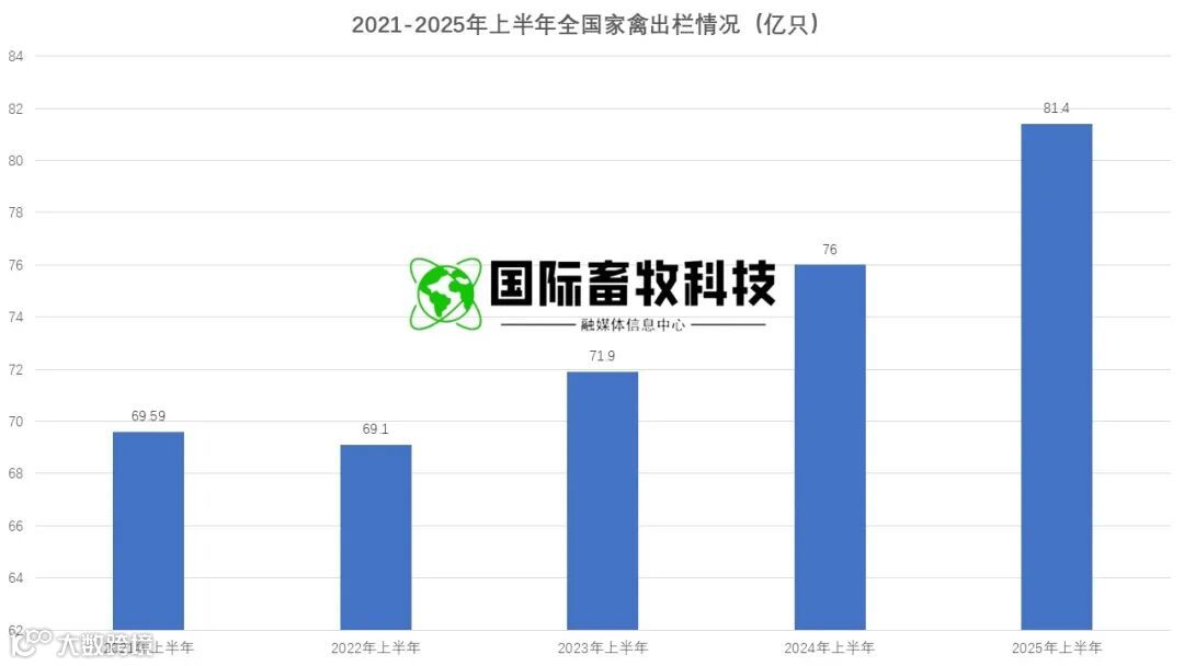 2025 年上半年全国家禽出栏量达 81.4 亿只,同比增长 7.0%,创 2021 年以来同期新高,其中二季度单季出栏 39.9 亿只,同比增幅高达 10.5%。