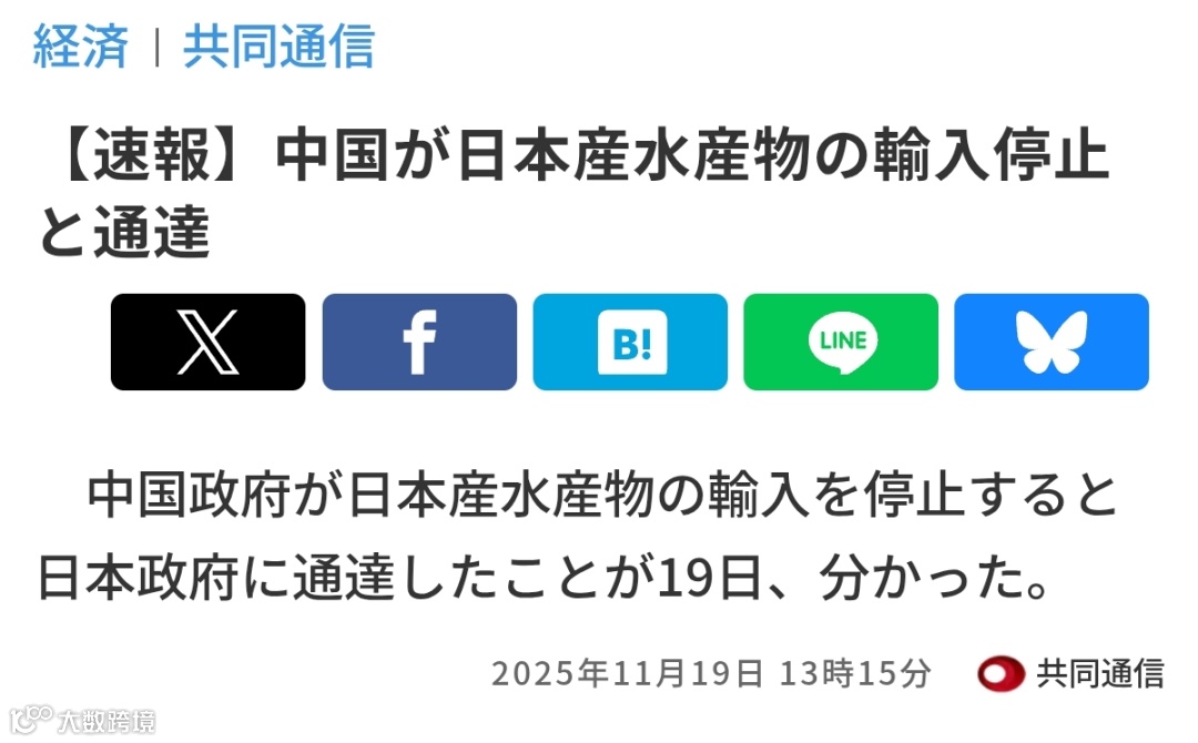 ⚠️ 2025年11月19日:中国通报暂停进口日本水产品。