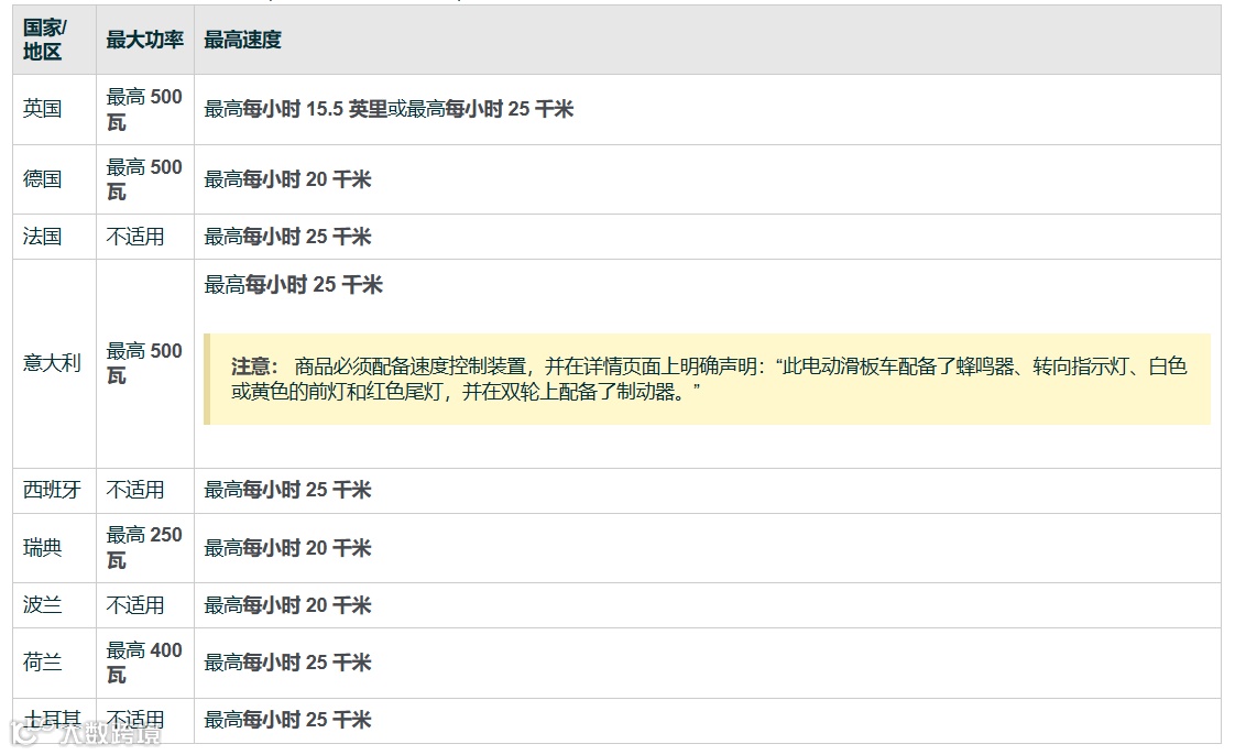- 电动滑板车不得超过当地法律规定的功率和速度限制,如下图所示: