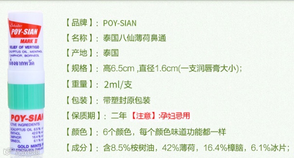 商品描述:该商品主要成分:含42%薄荷、8.5%桉树油、16.4%樟脑和6.1%冰片。主要用于提神醒脑、缓解头晕、通鼻塞、防中暑、防感冒、防蚊驱虫、止氧消肿等。
