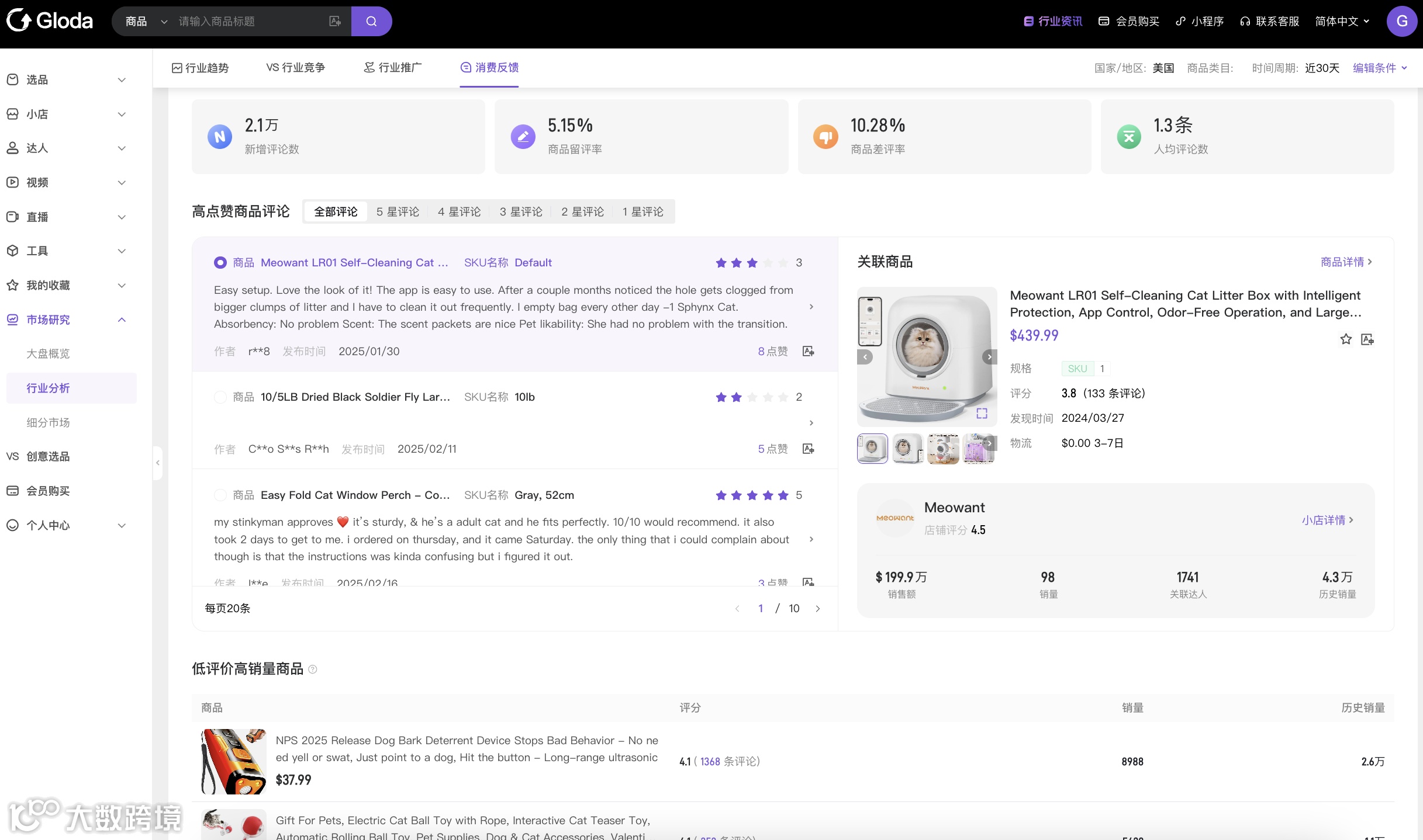 与PEAKS的“用户体验提升”相对应的是,Gloda解锁商品评论角度去深度分析用户的消费需求以及购物体验。商家可以利用Gloda的数据分析,了解用户对商品和内容的反馈,从而优化产品和服务,提升用户满意度和忠诚度。