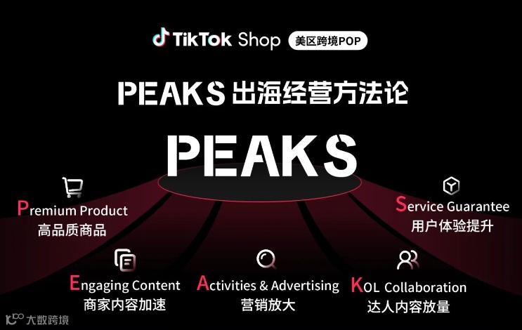 2025年2月25日的年度跨境商家大会中,TikTok Shop推出了PEAKS出海经营方法论,为商家在跨境电商市场中提供了一套清晰、完整的增长框架。PEAKS方法论涵盖了五大核心模块,商家可以从商品、内容、营销、KOL合作、用户服务等各个方面全面提升竞争力。