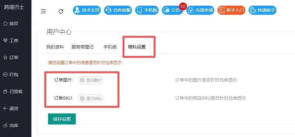 很多卖家会担心订单同步到仓库以后,会泄露自己的产品,毕竟产品对于跨境电商的卖家来说是核心机密。如果我们不希望仓库看到图片和商品信息,可以通过前台的私密设置把这些信息隐查,那仓库sku和图片也看不到了。