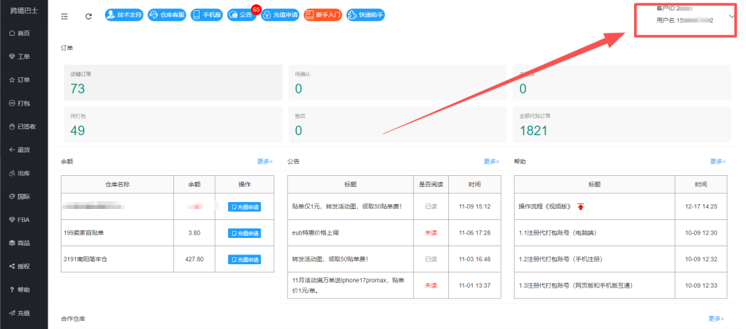 以跨境巴士为例首先我们需要注册账号,注册完成直接去登录,然后你就会来到这个界面,右上角的是你的客户ID。