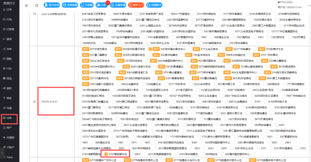 登录完成后第一步我们需要绑定仓库,以我的仓库为例,在仓库里找到OZON GUOO,在这里可以看到3191简丰仓,点击打勾保存设置就可以绑定我们仓库了。(如果你用的是CEL,就在CEL里边找)