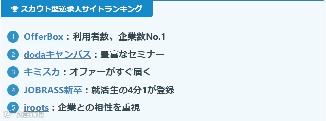 特点:企业招聘使用率高,34%的日本上市公司通过该平台招募人才;求职者上传简历后,企业主动联络;个人信息完整度达90%以上者,平均可获约26家Offer。