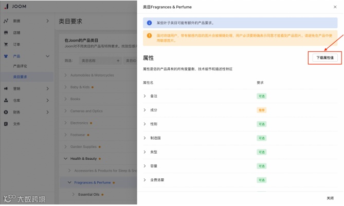 2.选择需要的类目,点击 "下载属性值 "按钮,以下载带有属性值列表的文件。