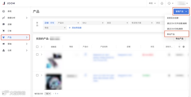 3.打开卖家后台产品页面,点击管理产品,选中移动产品;
