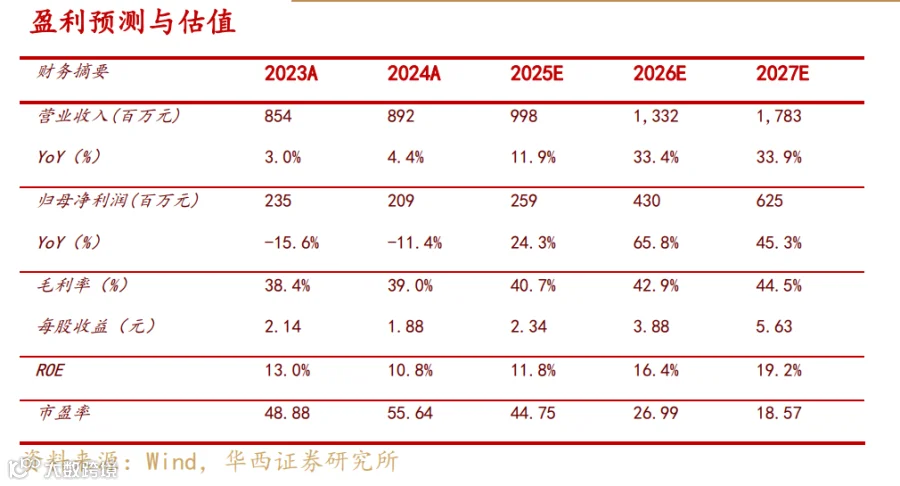参考2025年三季报,我们调整2025-27年业绩预测。预计公司2025-27年营业收入分别为9.98、13.32、17.83亿元(原值为10.49、14.28、19.20亿元),同比+11.9%、+33.4%、+33.9%。预计公司2025-27年归母净利润分别为2.59、4.30、6.25亿元(原值为2.90、4.52、6.41亿元),同比+24.3%、+65.8%、+45.3%。预计公司2025-27年EPS分别为2.34、3.88、5.63元(原值为2.61、4.08、5.78元)。2025年10月29日股价为104.6元,对应PE分别为44.75x、26.99x、18.57x,维持“买入”评级。