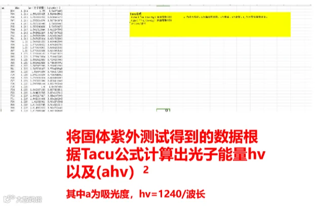 1. 首先,需要了解Tacu公式:(ahv)2=A(hv-Eg)其中a为吸光系数,h为普朗克常数,v为频率,A为常数,Eg为半导体基带宽度。同时吸光系数a与紫外光谱的纵坐标吸光度abs成正比,为了简化计算,通常会直接将吸光度代入到Tacu公式中,并不会影响公式的结果,从而得到光子能量hv和(abs*hv)2。