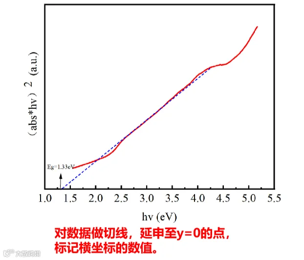 5. 最关键的一步,换算出来的数据图的直线部分做切线,并延伸到纵坐标为0处,确认横坐标的数值,即为材料的禁带宽度。
