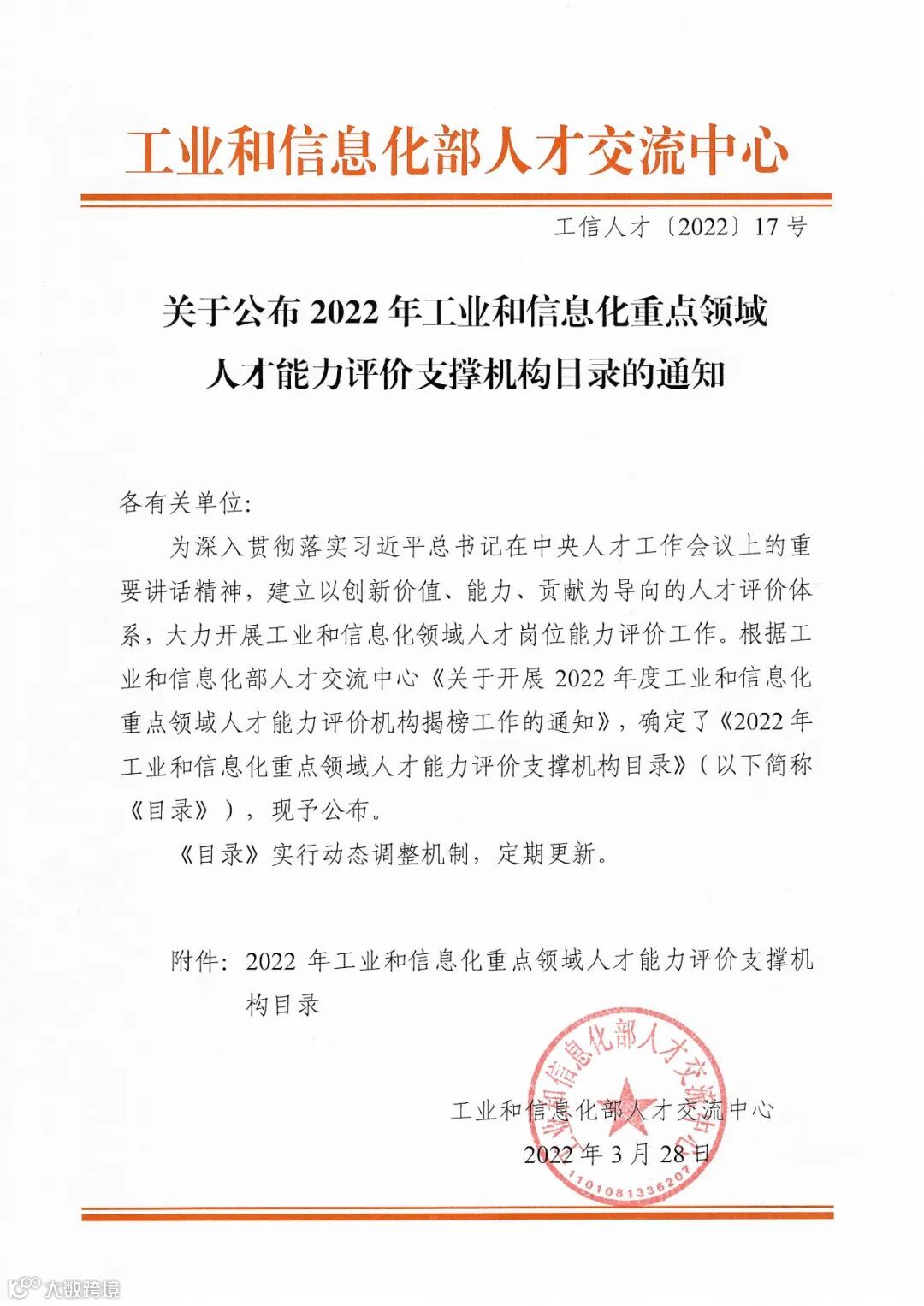 2022年3月28日, 国家工业和信息化部人才交流中心发布了工信人才〔2022〕17号《关于公布2022年工业和信息化重点领域人才能力评价支撑机构目录的通知》,四块科技通过综合评审,成功进入该名录,标志着四块科技通过在区块链领域的优势支撑获得了国家部委重点项目的服务能力认可。