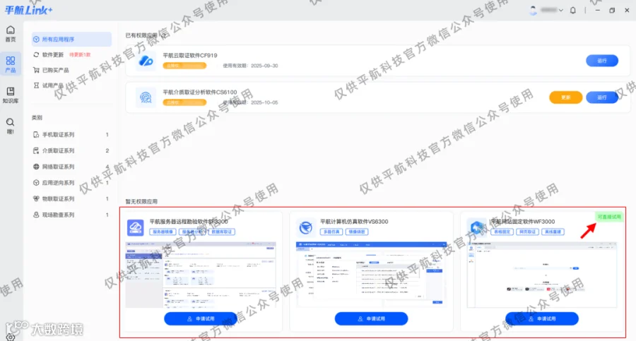 过去,用户无法及时、直观了解到平航科技有哪些前沿的取证产品与最新的取证工具,也不清楚具体的产品试用申请渠道。如今,Link+集中展示了平航所有可独立运行的取证产品,并支持自主申请试用。对于“可直接试用”的新产品,用户可一键快速体验;常规产品根据指引提示申请试用并通过审批后,系统将自动赋予权限,让试用赋权更加简单高效。