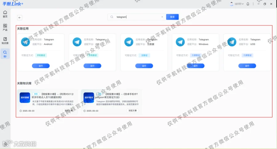 Link+的智能搜索功能提供跨模块全局检索能力,用户只需输入目标应用程序名称关键词,即可快速检索知识库、产品库等全部内容。该功能不仅能实时反馈平航产品对该应用的支持情况,还同步关联相关的技术解决方案、实战案例及操作指南等,帮助用户既精准定位工具,又即时获取取证经验,实现学用一体的高效闭环。
