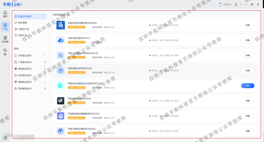 Link+整合了平航取证产品体系中所有可独立运行的软件,覆盖手机取证、介质取证、云取证、应用逆向、物联取证、网站固定等,并统一提供了在线高速下载渠道,彻底摆脱三方下载渠道分散、下载慢的问题。