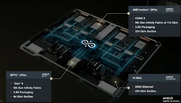 EPYC处理器的一个重要用途是与Instinct AI加速卡搭配使用。下一代Instinct MI400系列将基于CNDA 5架构,并采用3.5D Chiplets封装,配备第五代Infinity Fabric高速互连总线。这使得EPYC和Instinct MI400系列成为天然的最佳搭档。Infinity Fabric作为平台互连的重要组成部分,将为两者提供更高效的连接,进一步提升整体性能。