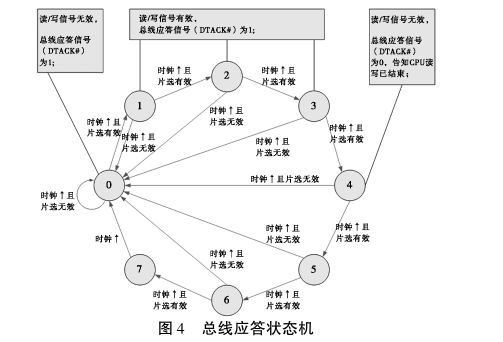 ●接口板模块的D20逻辑芯片,根据大片选MCS以及系统时钟信号,按照总线应答状态机(如图4),在MCS有效后的第4个时钟周期(约62.5ns×4=250ns),向CPU回复DTACK信号。