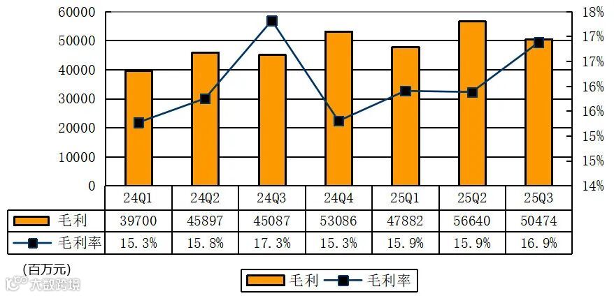 京东2025年第三季度毛利为504.74亿元,毛利率为16.9%。
