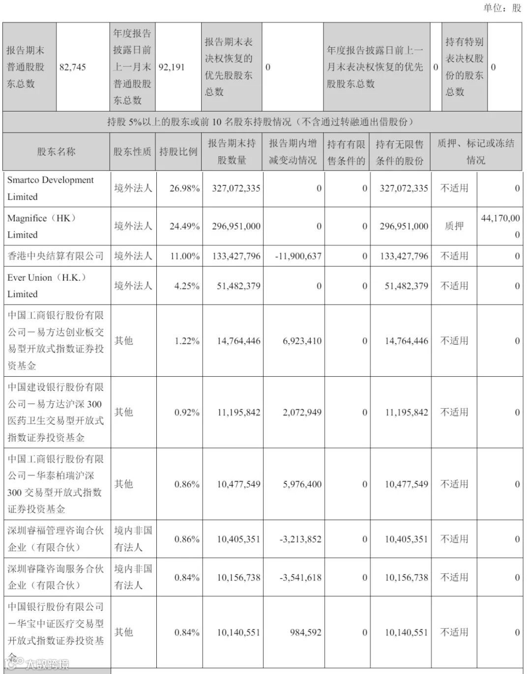 截至2024年12月31日,Smartco Development Limited持股26.98%,Magnifice(HK)Limited持股24.49%,香港中央结算有限公司持股11%,Ever Union(H.K.)Limited持股4.25%;