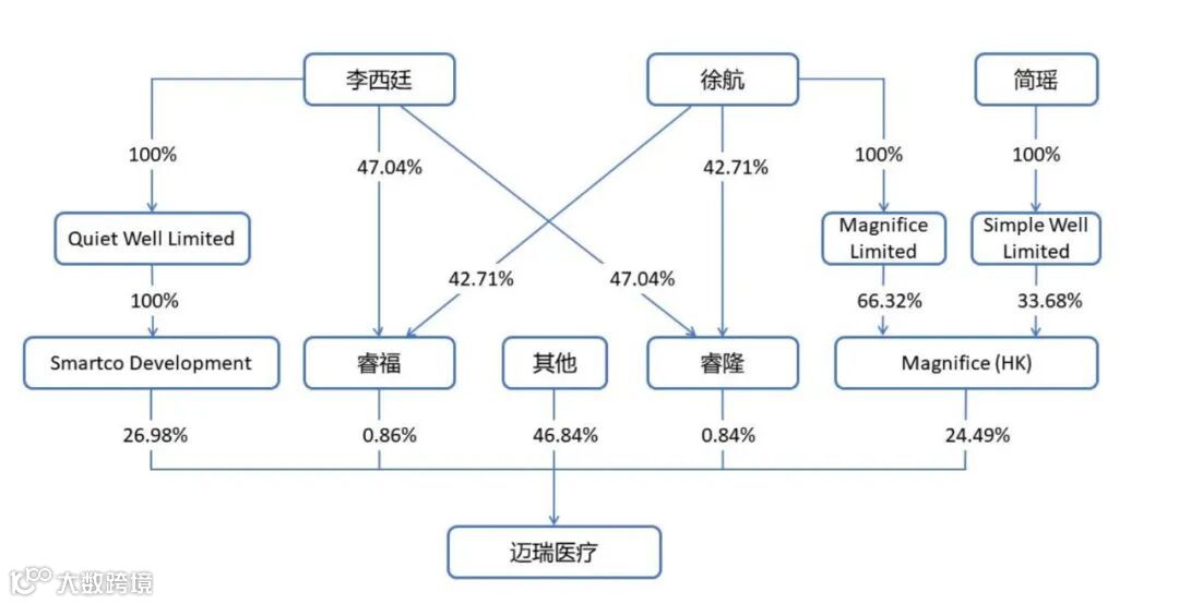 迈瑞医疗创始人李西廷持有Smartco Development Limited 100%股权,分别持有睿福、睿隆47.04%股权,徐航分别持有睿福、睿隆42.71%股权,徐航还控制Magnifice(HK) 66.32%股权,简瑶控制Magnifice(HK) 剩下33.68%股权。