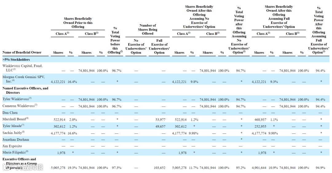 IPO后,Winklevoss Capital持有100%的B类股,有94.7%的投票权;Morgan Creek Gemini SPV持有9.8%的A类股。