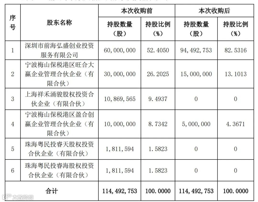 此次交易后,前海弘盛持股为82.5316%,旺合大赢持股为13.1013%,盈合创赢持股为4.3671%。
