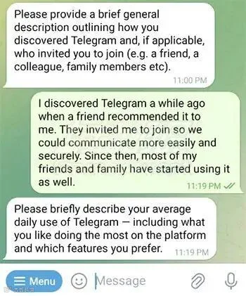 5、回答“如何发现Telegram的”以及“邀请您加入的人员”问题,发送以下文本: